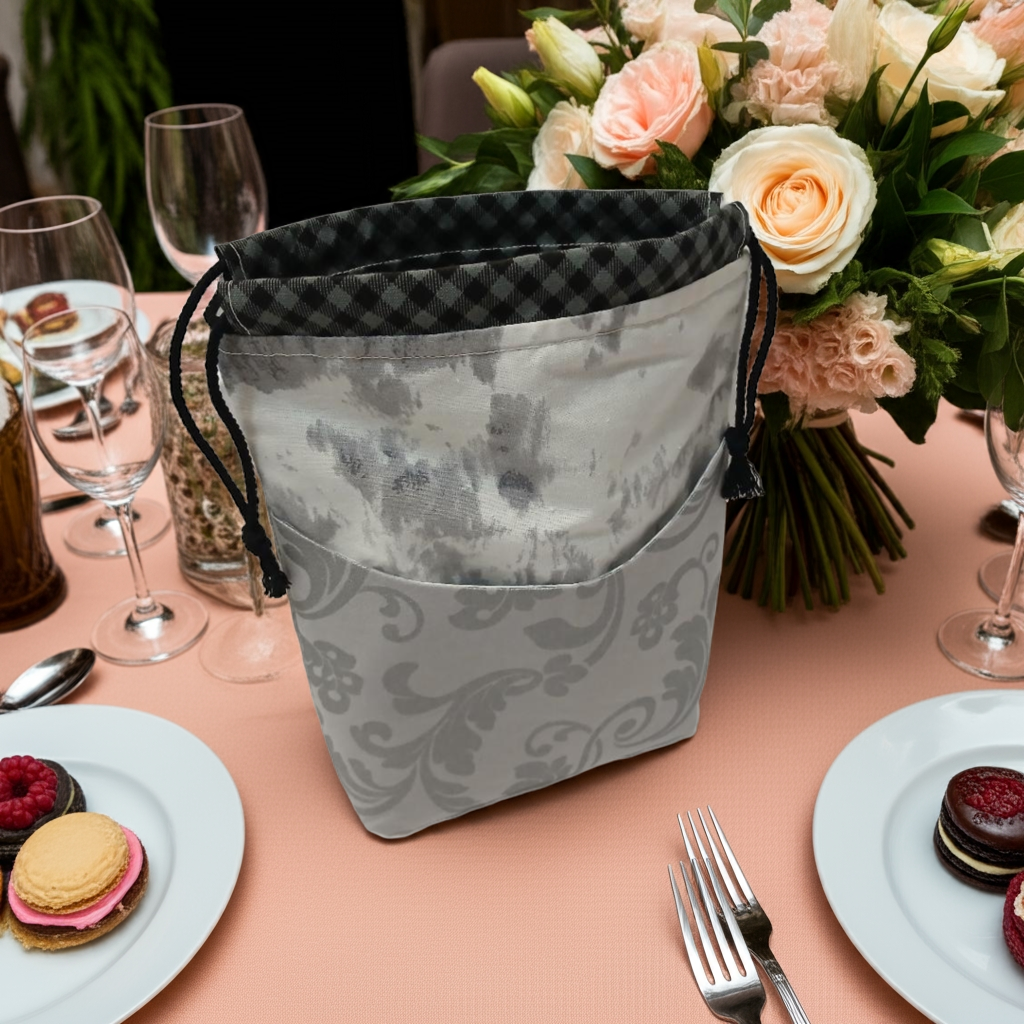 Small enough for convenience, but big enough to hold the daily necessities. Fun little drawstring bag that has a pocket on the front and when closed, the strings are long enough to hang around the wrist, so you can keep your hands open for other important things. Pouch measures 10 inches deep, 6 inches long, and 2.5 inches wide. Fully washable. Email for custom requests!